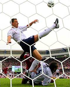 This little page is reserved for Breaking News and Comment on the competition as and when my enthusiasm comes: 2nd May: Web Site opened for Beta Testing. 20th May: Some Celebrity comments received and posted up. 21st May: Formal Competition Launch. 22nd May: First entry received. For the record, a pessimistic Scouser forecasting England's demise in the first round. Cheery public email thread circulates. 23rd May: Three more entries received. Cheery public email thread turns nasty. Organiser's misgivings grow. 25th May: England 1 - 2 Belarus. Liverpudlean smirk grows. First entry in the Anagram competition received, and a surprisingly high standard is set. 29th May: More Celebrity Comment received, some posted up. 30th May: England 3 - 1 Hungary. There'll be worried brows on Merseyside following a good England victory. Critics of Peter Crouch who want to see him score more goals are forced to re-assess their views following his ludicrous "Robotic Dance" goal celebration. 31st May: Shows what I know, the world's gone crazy for the Crouch Vogue. This summer embarrassing Uncles will be honing their skills at Weddings across the nation. 1st June: Would you believe it, more Celebrity Comment received, and some even posted up. 3rd June: England 6 - 0 Jamaica. More "Worry on the Wirral" following a fine display from surprise package Peter Crouch, really perfecting his cybernetic samba with its new-found "By Royal Appointment" status. What will those foreign commentators make of it all? 5th June: Serial nutter Uri Geller crops up on national radio and organises a "mass concentration" amongst the listenership to "will" Rooney's foot to recover. Apparently this is to help us win the World Cup. Why all this mental effort isn't simply put into willing England to win the World Cup directly, cutting out the middle man, isn't made clear. 7th June: Rooney's scan comes through and the MUFC replacement team doctor, despite copious "stiffening" from Sir Alex "King Canute" Ferguson, is able to show only token defiance to the national clamour. The best he can do is divert it to the third umpire, and Rooney's in! Picture the scene in the Ferguson front room: It's July 9th and Wayne Rooney has just scored a hatrick in a famous 3-2 victory over Brazil to win England the World Cup. In the post match frolics he drops the Golden Goblet on his 4th Metatarsal and is ruled out until Christmas. "Think I'll just pop out to the shops dear" says Mrs F...... 8th June: Sven makes clear his intent to use Rooney against the Viking foot-stampers should it be necessary, citing the interests of 40 million England fans. Sir Alex is only restrained by his tethered choke chain from taking them all on at once. The competition entries are posted up! (well almost all, we're just pending a late Clayton-family surge). Let battle commence....... 9th June: We're off! Germany coast it but Ecuador upset the collective apple-cart and there are no ten-pointers at all. Pathetic. Widespread pleasure at seeing Spockie adopting his traditional location in the league table somewhat tempered personally. 10th June: England cling on for a dodgy victory despite the second half display of the Paraguayans, urged on by a greasy foreign referee. Many hype-resistant players get their first "Red 10s" on the board. T&Ts hard-fought draw against the Swedes was correctly foreseen by just two inspired veteran campaigners, Julie Perkins and Mike Walshe - cream beginning to rise? It seems to be a young man's game now with Chris Herbert and Tom Sleath joined in second place by player of the day Tom Clayton with his two 10s and a total haul of 22 points, but still up front is the only pairing in the competition, Ian & Claire Woodland. Worry not - should their success continue to the end their points will of course be split between them. There might also have to be 60 other such technicalities raised as the personal nightmare continues. 11th June: More ludicrous results totally out of line with the Guardians 100 page World Cup Special Supplement. Yesterday's best haul of 22 points is now a mere bagatelle as David Jackson, Judith Bell, Chris Herbert, Wally West, Mike Walshe, Lee Henderson as well as our two-headed hydra "I&C Woodland" match the feat. 12th June: Play of the day by Ian Maylin and Graham Clayton who held their nerve to correctly predict the three Australian goals in the last 8 minutes, Ray Charlton's celebratory jig over news of Cahill's equalizer being mercifully cut short by news of Cahill's second. In the evening kick-off the Italian team overcome the problem of unsightly underarm sweat rings appearing in the second half by having them built into their shirt design from kick-off. Schoolboy defensive error gifts them a second, leaving a Burgess trio at the bottom of the table, the little ones really putting into practise those skills drilled on the training ground. Poor discipline shown by Mrs B allows her to make a break for mid-table obscurity. Ed Sleath claims the day's only 22 point haul, firmly planting his Watford flag in 27th position. At the business end, it's as you were with I&C being closely tracked by Herbert Junior. Yet more Celebrity Comment received and posted up here. Special thanks to Matt Micale who is apparently like this with Carol Beer. If you too happen to be on gossiping terms with any celebrities, please feel free to let me know their pearls of wisdom. 13th June: A tremendous day's luck for Ian Maylin, his 26 points catapulting him from 10th to 1st place, knocking the Woodland duo off that coveted spot for the first time. Dave Beale is equally impressive in his own way, being unable to muster a single point all day. It's generally a volatile day with big winners such as SciTech's finest David Jackson, Steve Bell, Malcolm Clayton and Silvertech raider John Irwin all moving up the ranks. Unfortunately this volatility doesn't extend to the bottom of the table. Spockie, so often a subject for these commentaries, is revelling in his